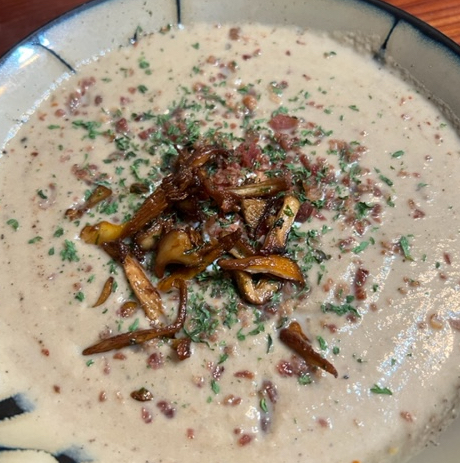 Creamy wild chanterelle mushroom soup topped with fresh herbs, bacon, and fried chanterelles