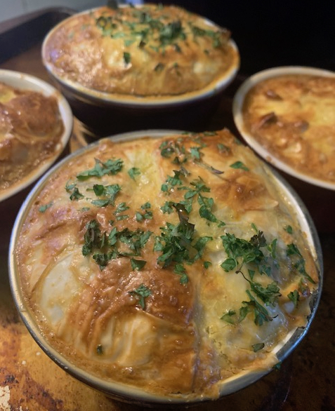 Delectable Root Down Farm turkey pot pies in a flakey phyllo dough crust filled with mashed potatoes, gravy, carrots, peas, and fresh, foraged greens & herbs