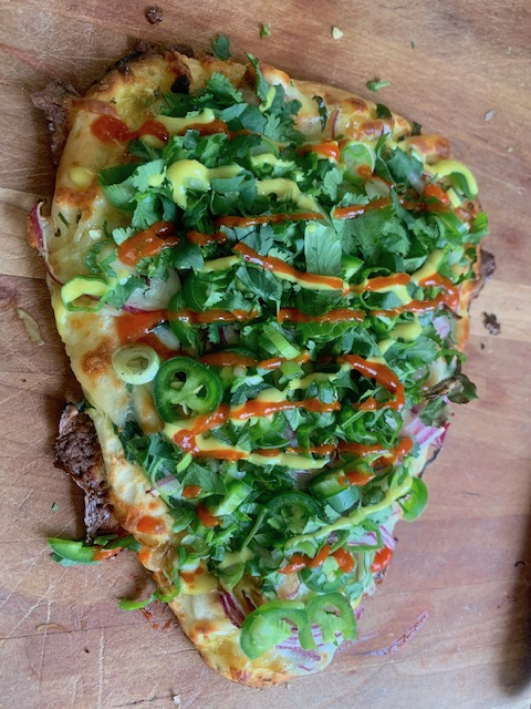 Wood fired pizza with a coconut-curry sauce, mozzarella, slow braised tandoori chicken, red onion, and fresh local and foraged herbs; drizzled with coconut-curry and chili sauces